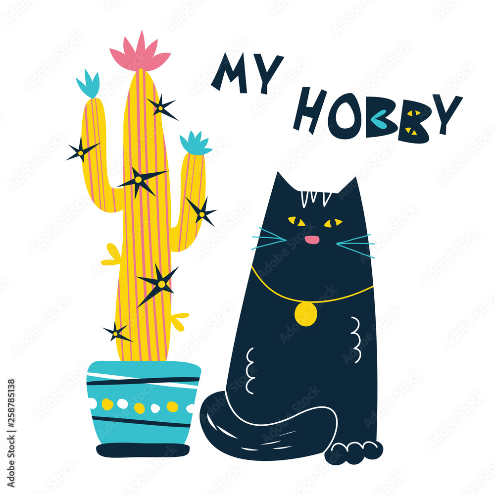 My Hobby Is Hand Drawn Cactus And Pet Cat Set Cute Cat And Tropical Cactus Scandinavian Cartoon Style Design Great For Children S Print Covers Scrapbooking Games Applications Children S Book 1 Stock Vector